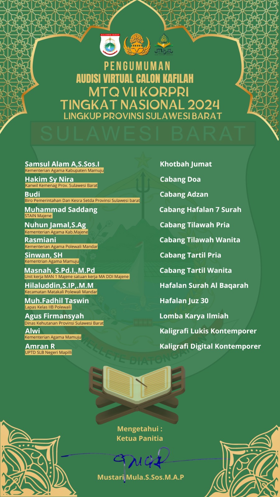Sebanyak 13 peserta dinyatakan lulus setelah mengikuti audisi yang berlangsung secara virtual selama tiga hari. Audisi ini diselenggarakan oleh Dewan Pengurus Korpri Sulbar dan melibatkan dewan hakim seperti Imam Masjid Al Markaz, KH Hasan Basri, Ustadz Khalid Rasyid, dan Dr. K.H. Abdul Azis Tammauni.