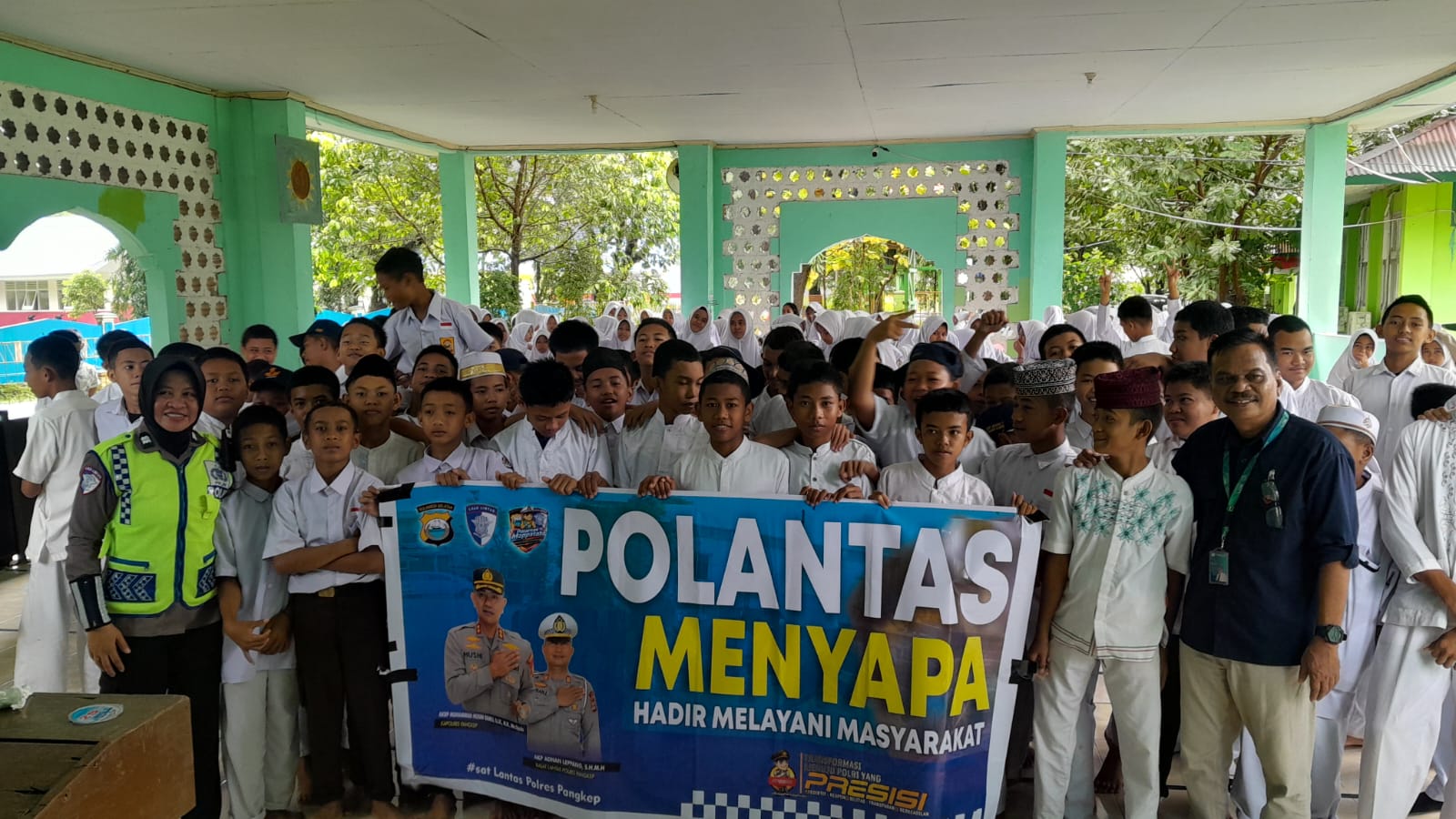 Satlantas Polres Pangkep bersama pelajar SMPN 1 Tonasa saat kegiatan Polantas Menyapa dalam rangka Operasi Keselamatan Pallawa 2026.