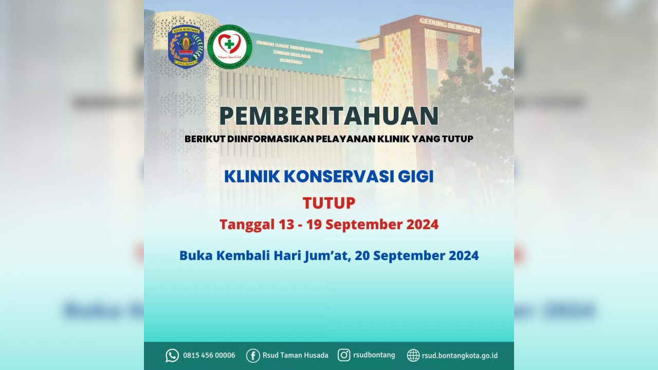 Penutupan sementara ini terjadi karena dokter gigi spesialis konservasi gigi di RSUD Taman Husada yang saat ini sedang dalam keperluan pribadi.