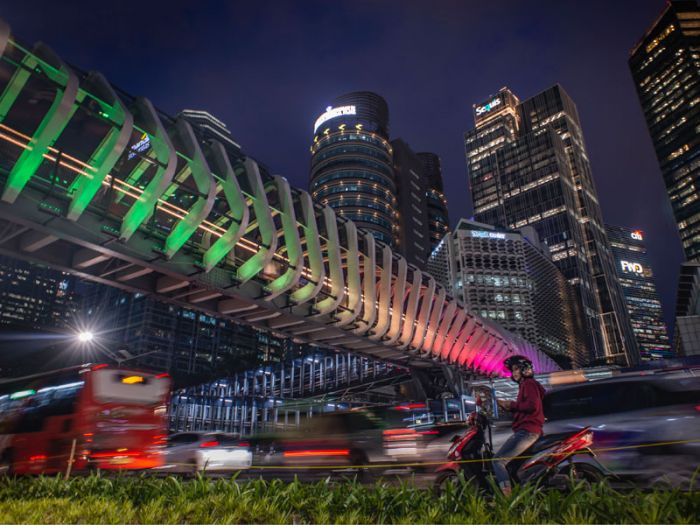 Warna-warna bendera Selandia Baru akan dimunculkan selama seminggu di jembatan penyeberangan orang (JPO) Gelora Bung Karno.